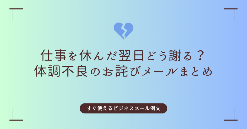 体調不良で仕事を休んだ翌日、「どう謝ればいいのか」と悩む人は少なくありません。特にメールでの対応は、言葉選びひとつで印象が大きく変わります。 この記事では、仕事を休んだ翌日に送るお詫びメールの基本マナーから、すぐ使える文例までを分かりやす... -
